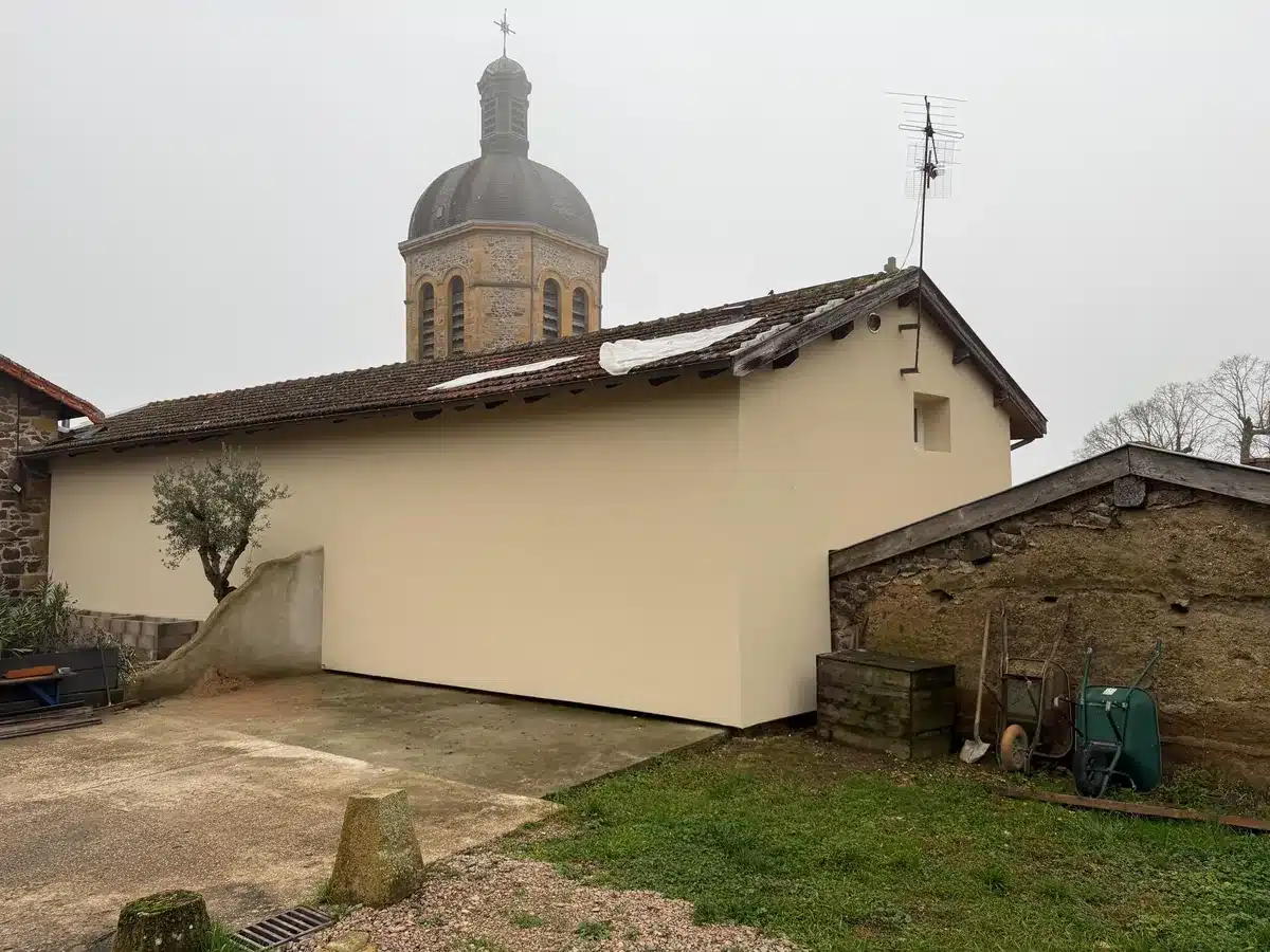 Sur ce chantier situé dans le Beaujolais (69620), nous avons réalisé une isolation thermique par l’extérieur en fibre de bois, avec un objectif clair : améliorer le confort du bâtiment tout en soignant l’aspect final des façades.